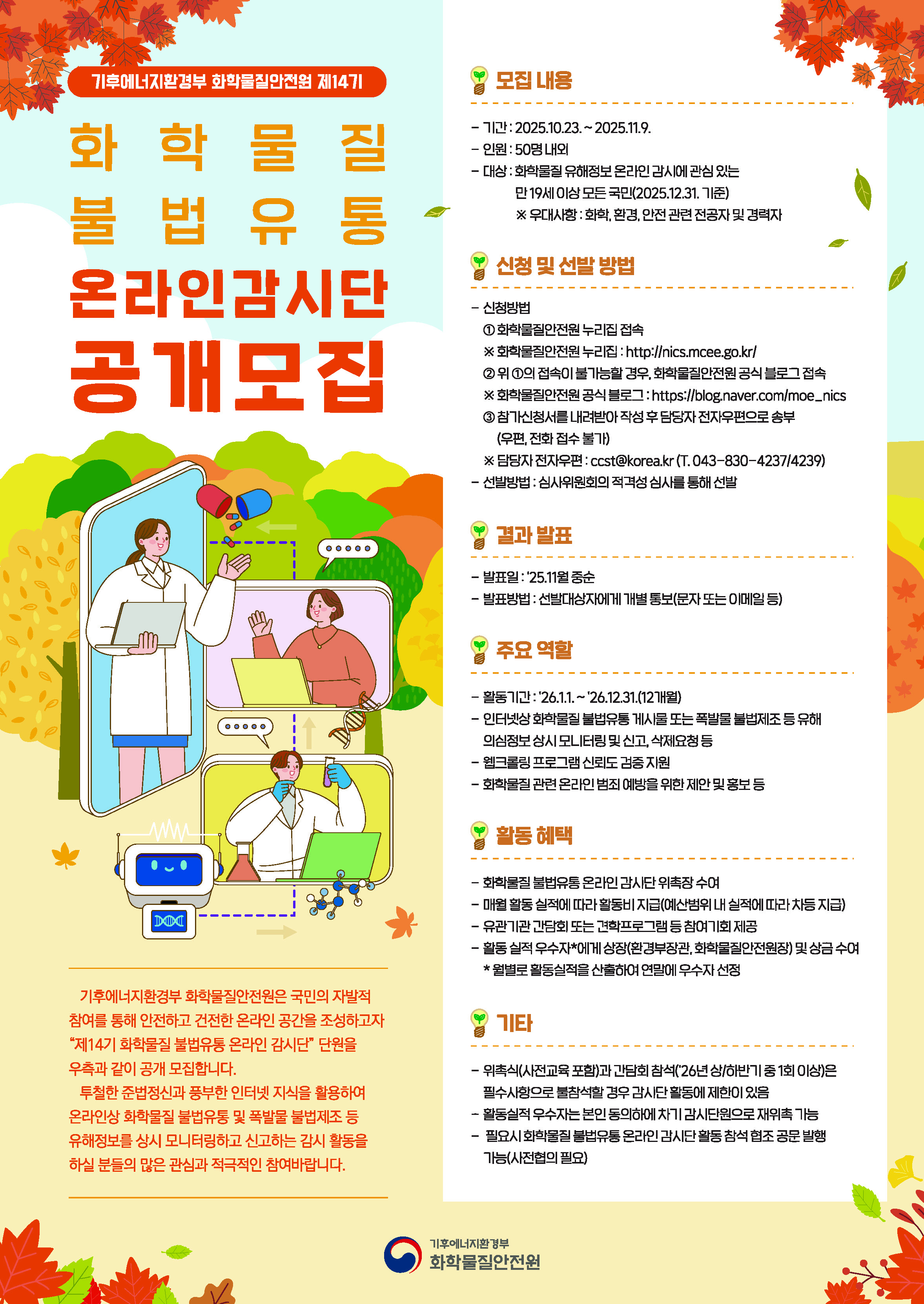 화학물질안전원에서 「제14기 화학물질 불법유통 온라인 감시단을 공개 모집(연장)」합니다. 관심있는 학생들은 많은 참여 바랍니다.