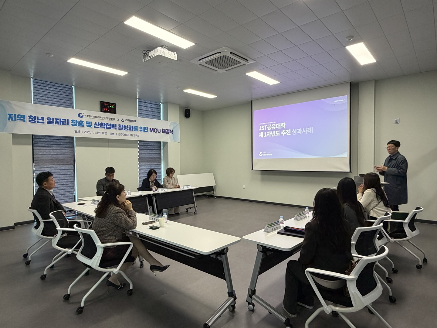 JST공유대학 최진하 본부장은 “청년들이 지역에서 배우고 성장하며 정착할 수 있도록 교육과 산업의 연결고리를 강화하겠다”고 밝혔으며, (사)전주벤처기업육성촉진지구발전협의회 윤미영 사무국장은 “지속 가능한 지역 청년 일자리 생태계 조성을 위해 대학과의 협력을 확대하겠다”고 화답했다.