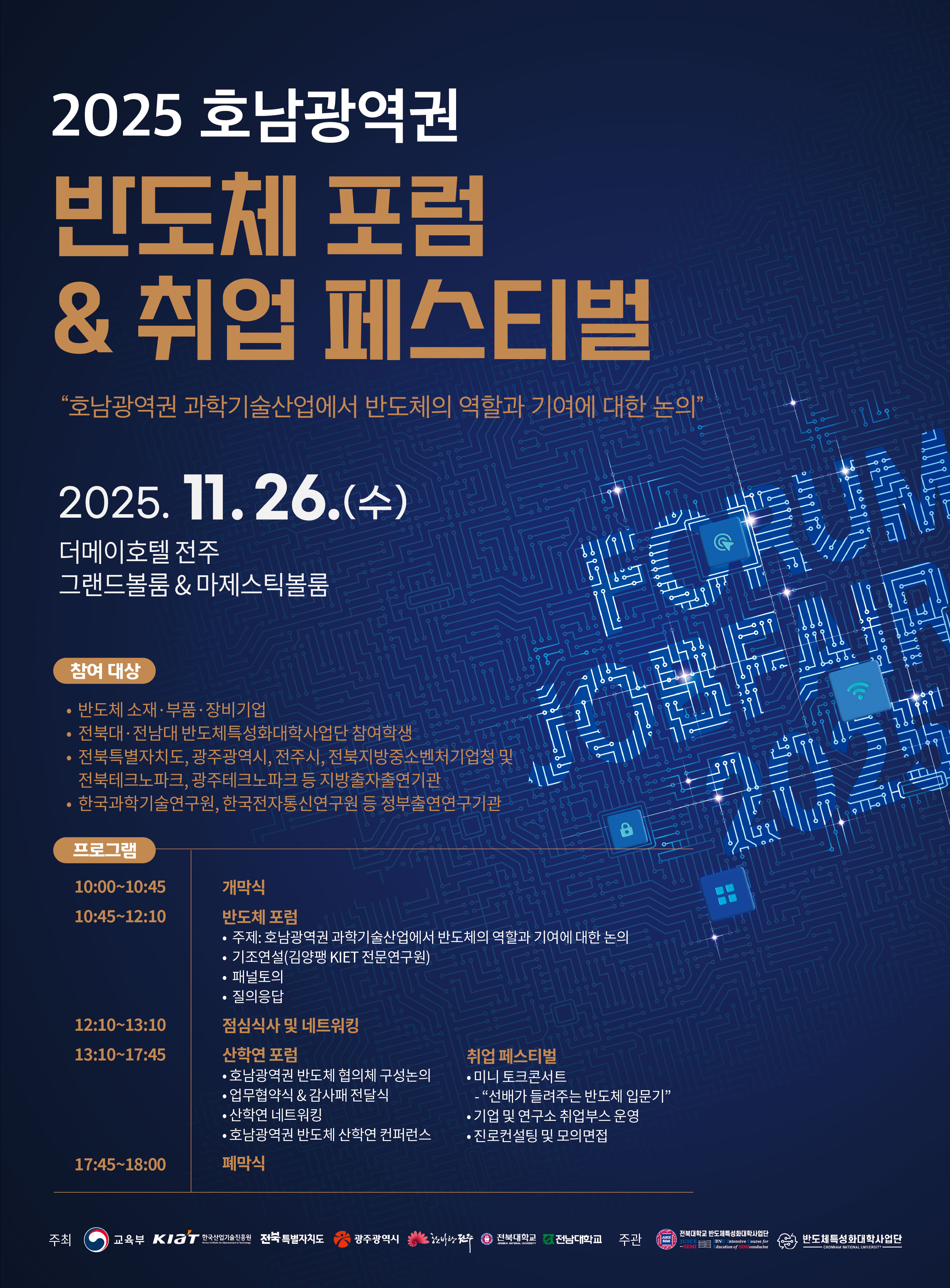 이번 포럼에는 전북특별자치도, 광주광역시, 전주시, 반도체 협회, 반도체 산업체, 반도체 연구소, 30여개 반도체 소재 부품 장비업체 관계자, 전북대-전남대 반도체특성화대학사업단 관계자 및 반도체융합전공 참여 학생 등이 참여한다.