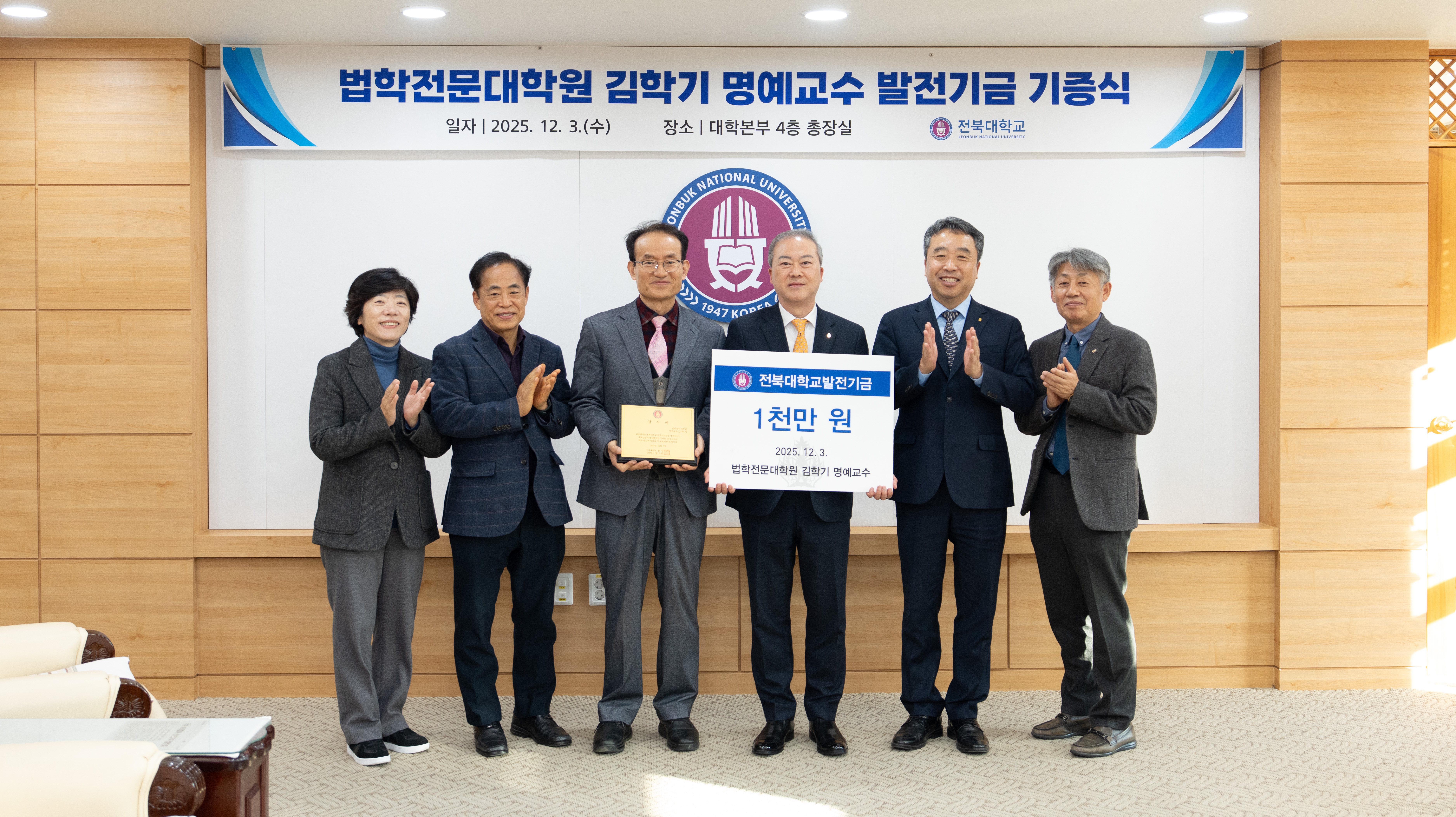 김학기 전북대 명예교수(법학과)가 대학 경쟁력 향상을 기원하며 1천만 원의 발전기금을 전북대 발전지원재단에 기부했다.