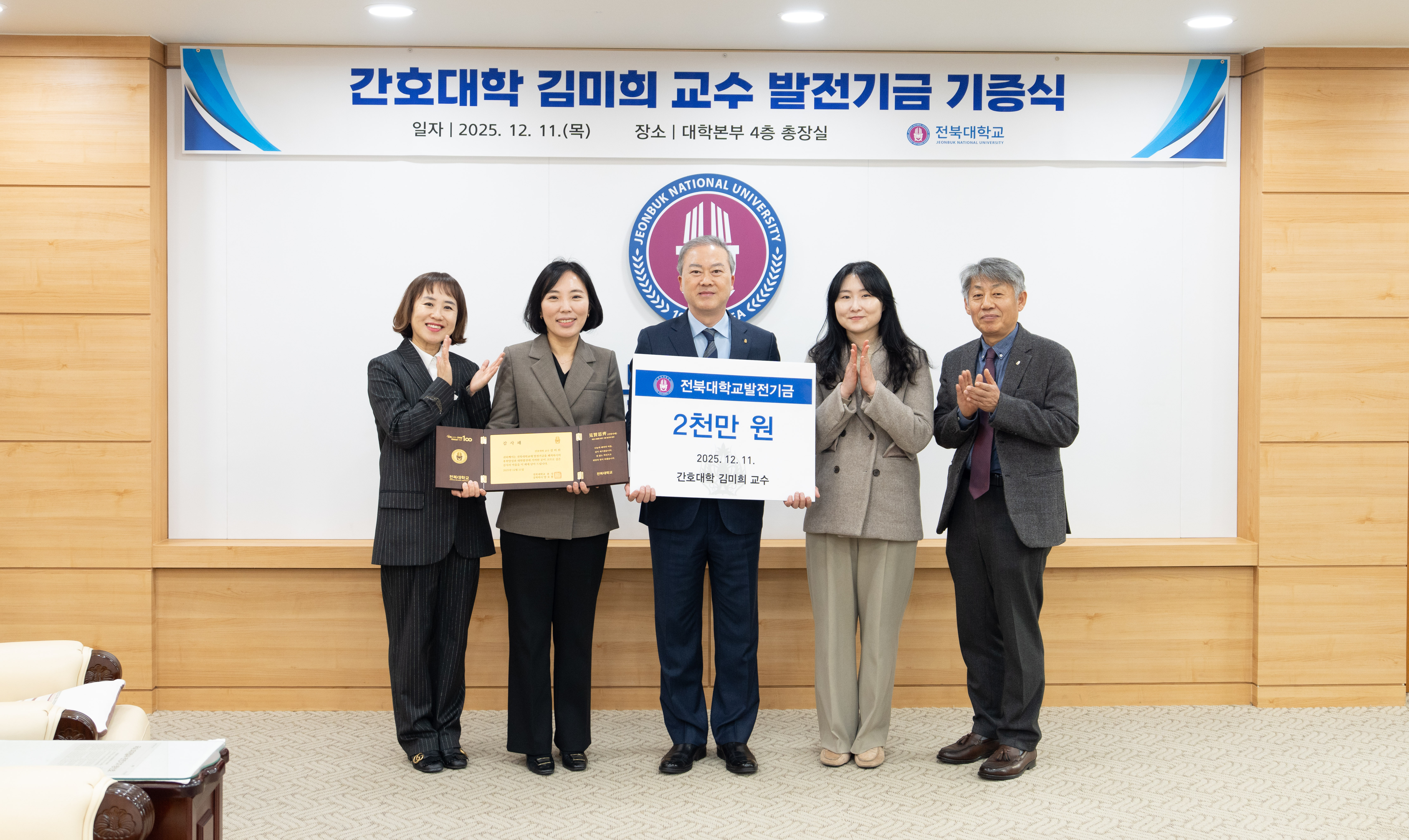 전북대학교 간호대학 김미희 교수(간호학과)가 대학 경쟁력 향상과 후학 양성을 기원하며 간호대학 발전기금 2천만 원을 기부했다.
