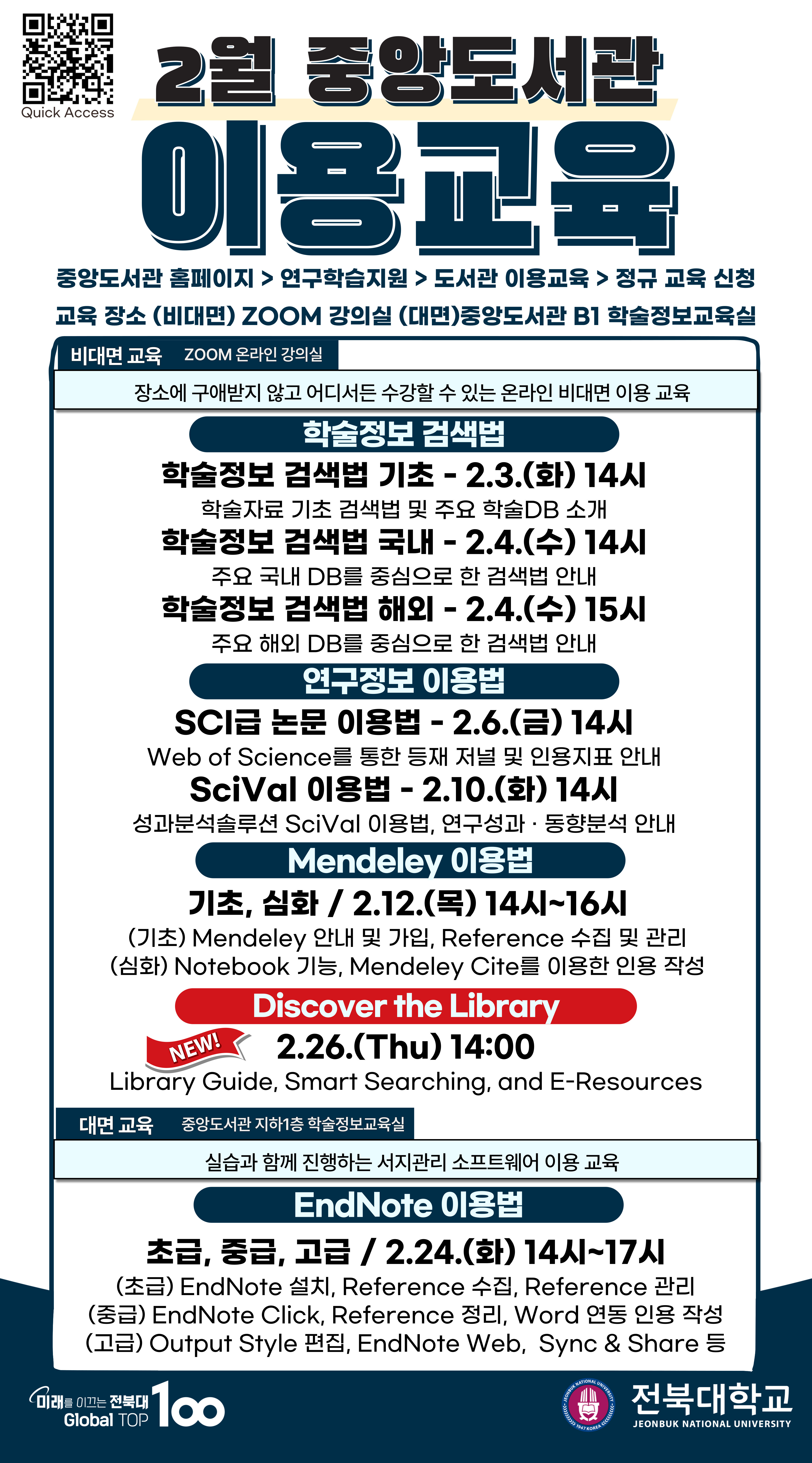 4. 교육문의: 중앙도서관 학술연구지원팀(270 4408, lib4407@jbnu.ac.kr)