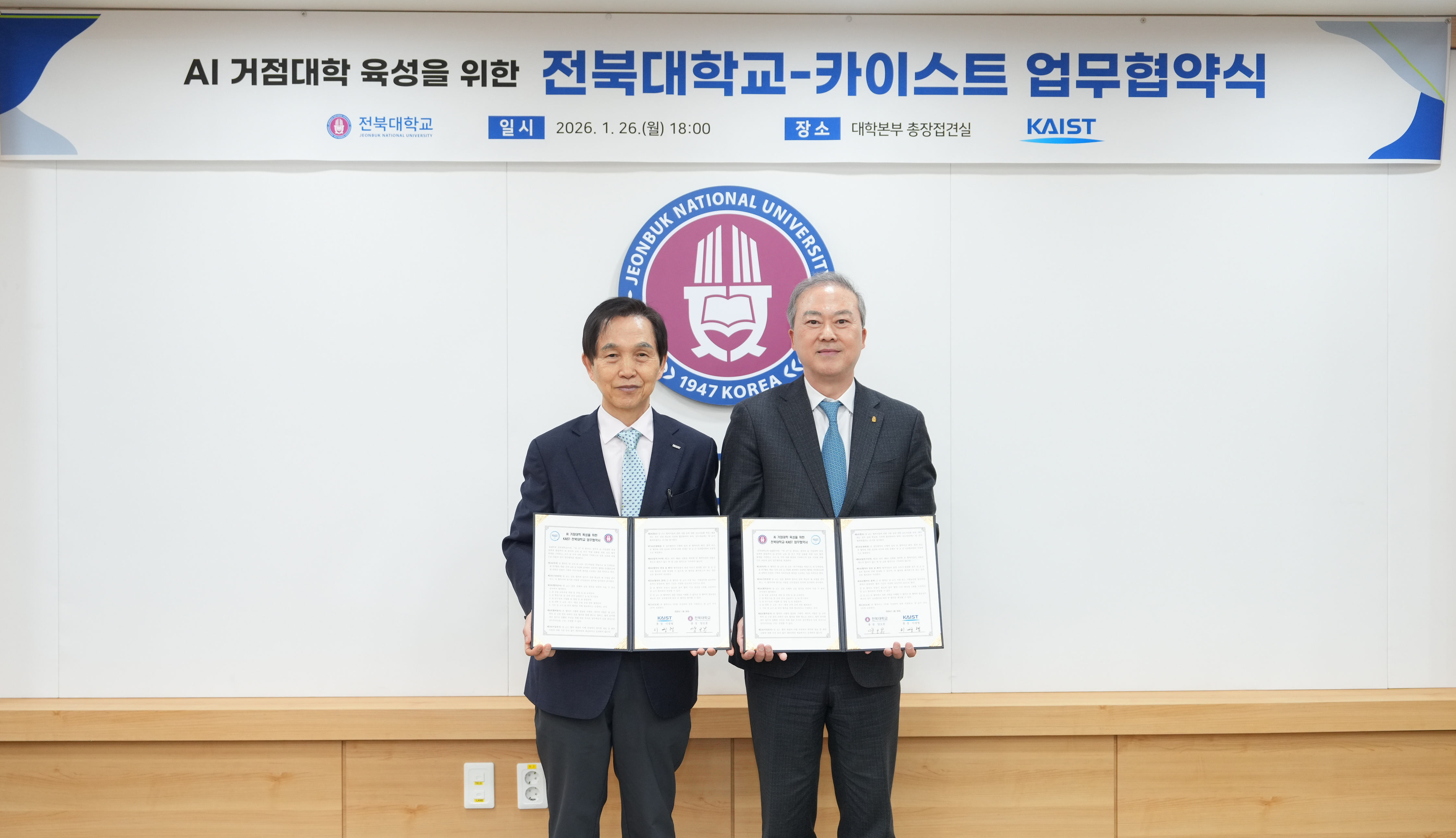 전북대는 26일(월) 오후 6시 대학본부에서 카이스트와 ‘AI 거점대학 육성을 위한 업무협약(MOU)’을 체결하고, AI 분야 인재양성과 연구 경쟁력 제고를 위한 협력 체계를 구축하기로 했다.