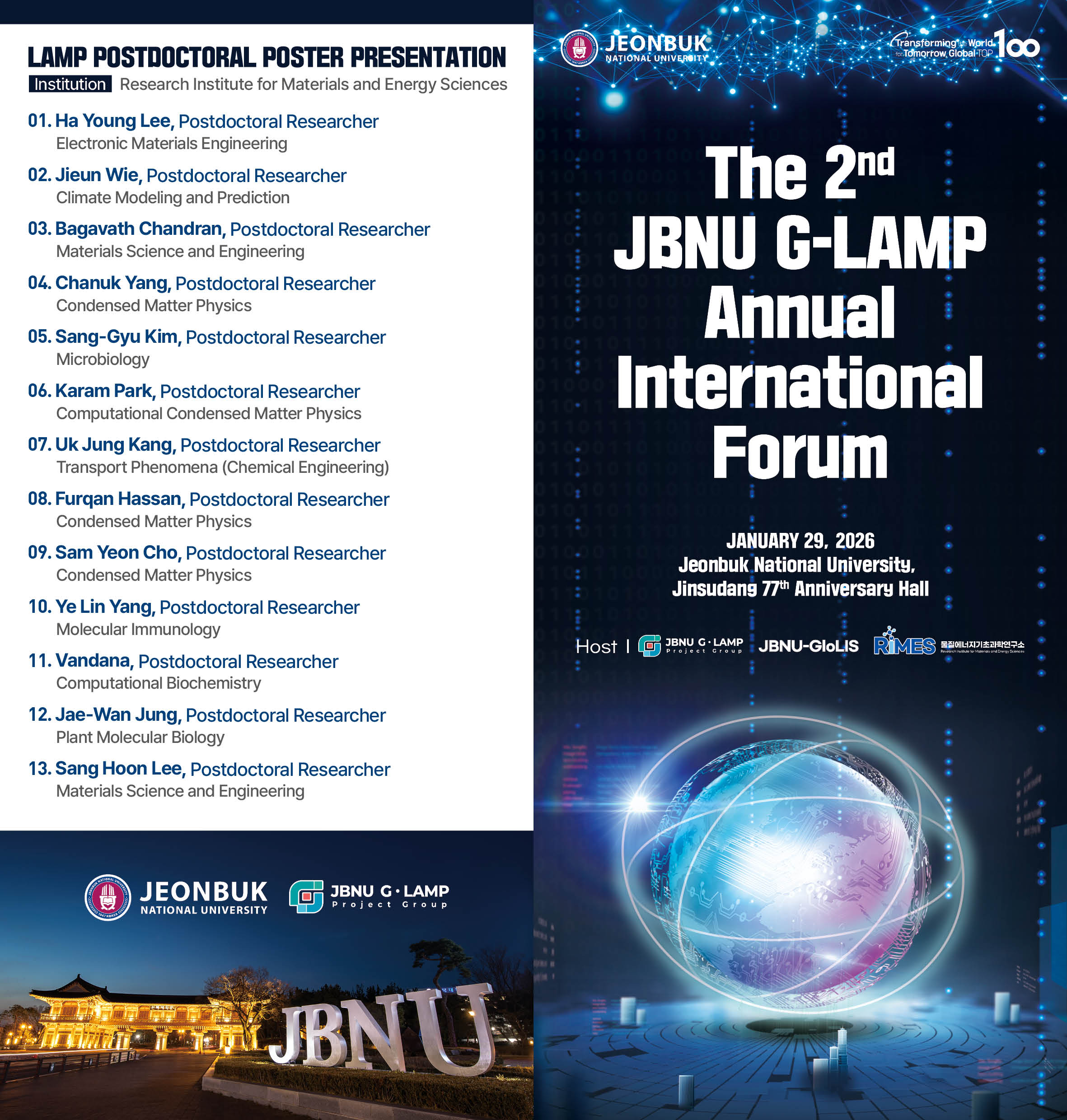 특히 이번 포럼에서는 G-램프(LAMP) 사업 참여 연구진 28명이 현재 수행 중인 연구과제를 공유하며 전북대의 연구 역량을 선보이는 동시에, 국제공동연구 확장 가능성도 점검한다. 이 가운데 양지민 교수(전북대 분자생물학과) 등 다수 연구자들이 참여해 연구 성과와 추진 방향을 소개한다.