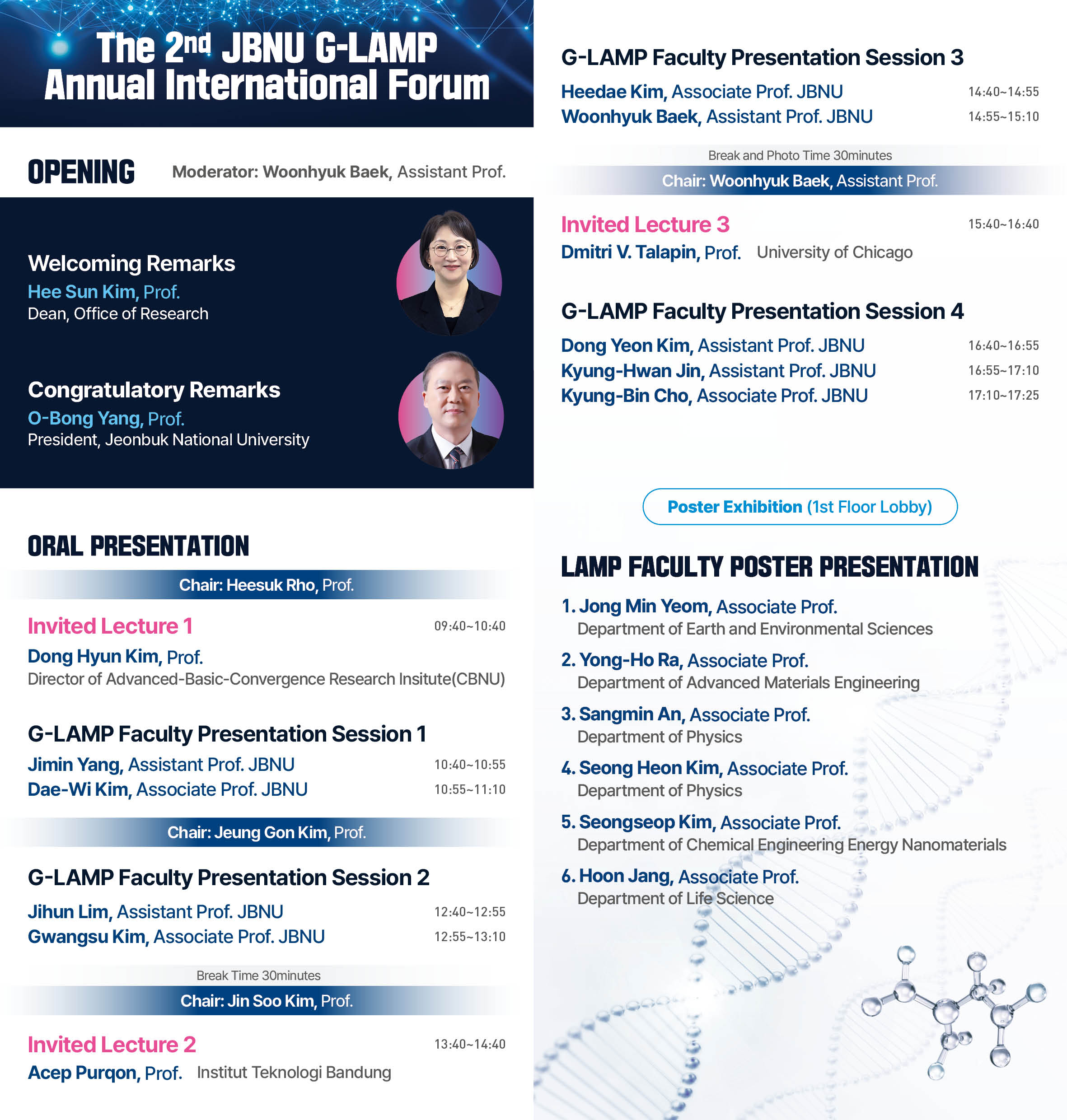 김희선 전북대 G-램프(LAMP)사업단장은 “지난 국제성과포럼에 이어 두 번째 성과포럼을 개최하게 돼 매우 기쁘게 생각한다”며 “이번 포럼이 국내외 기초과학 연구자들의 학문적 교류를 극대화하고, 국제공동연구를 위한 새로운 전환점이 되기를 기대한다”고 말했다.