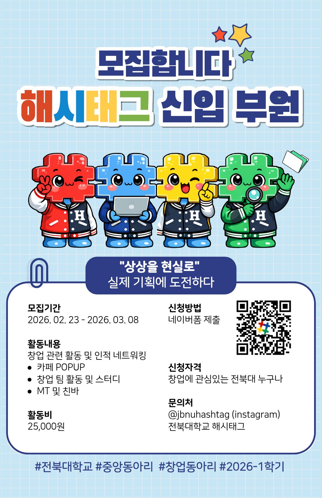 ํ•ด์‹œํƒœ๊ทธ ์ฐฝ์—…๋™์•„๋ฆฌ 2026-1ํ•™๊ธฐ ์‹ ์ž…๋ถ€์› ๋ชจ์ง‘