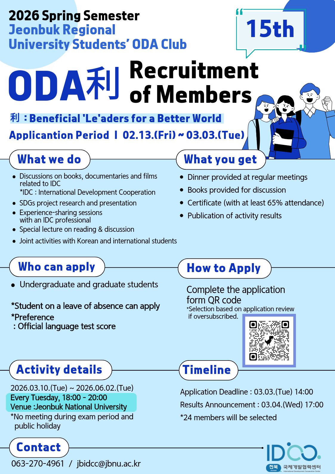 전북국제개발협력센터에서 2026 상반기 [전북지역 대학(원)생 ODA 동아리 "ODA利" 15기]를 모집합니다!