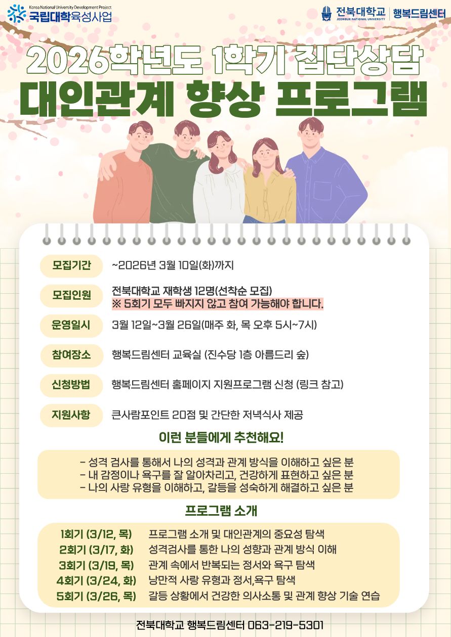 - 대     상 : 대인관계 증진을 원하는 재학생 12명 (선착순 접수)