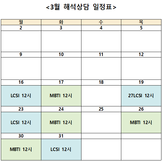 ○ 4월 심리검사 신청 일정은 3월 넷째주 월요일(3/23) 오후에 확인할 수 있습니다.