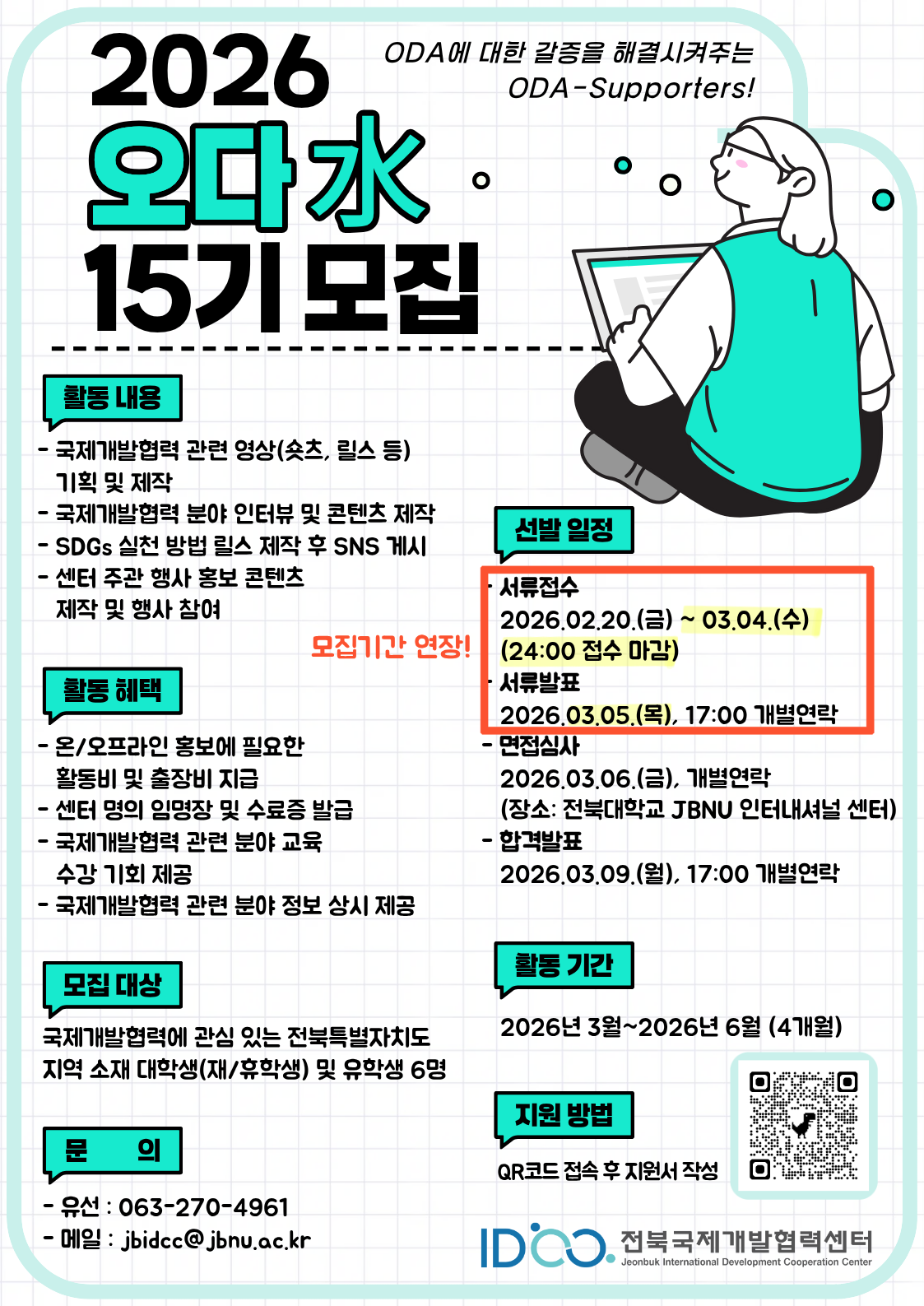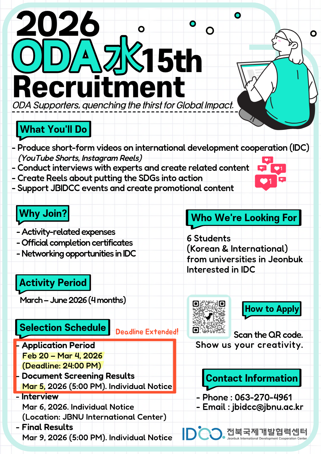 [๊ธฐ๊ฐ„์—ฐ์žฅ][์ „๋ถ๊ตญ์ œ๊ฐœ๋ฐœํ˜‘๋ ฅ์„ผํ„ฐ] 2026 ์ƒ๋ฐ˜๊ธฐ ์ „๋ถ์ง€์—ญ ๋Œ€ํ•™์ƒ ODA ํ™๋ณด๋‹จ ODASU(ๆฐด) 15๊ธฐ ๋ชจ์ง‘