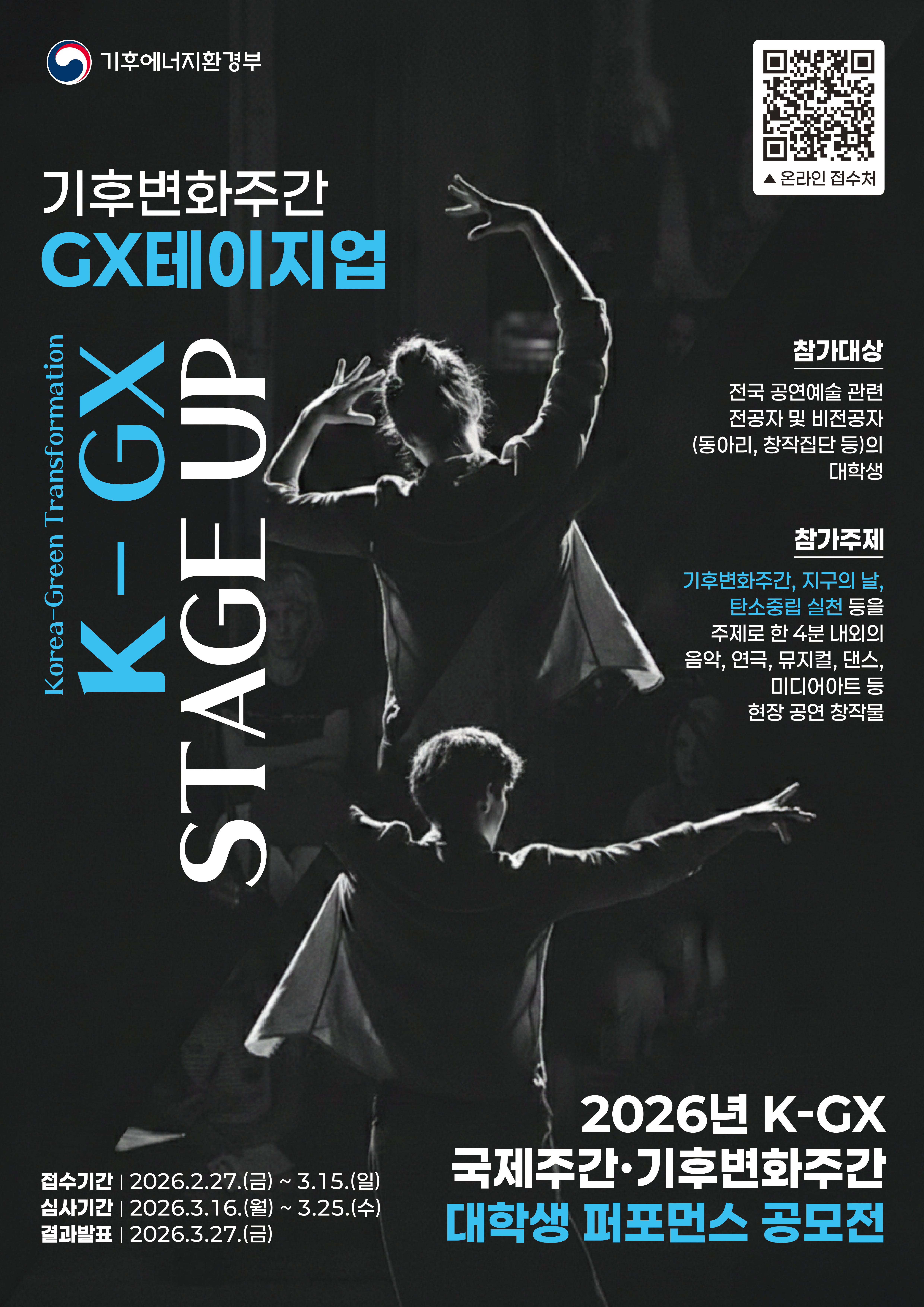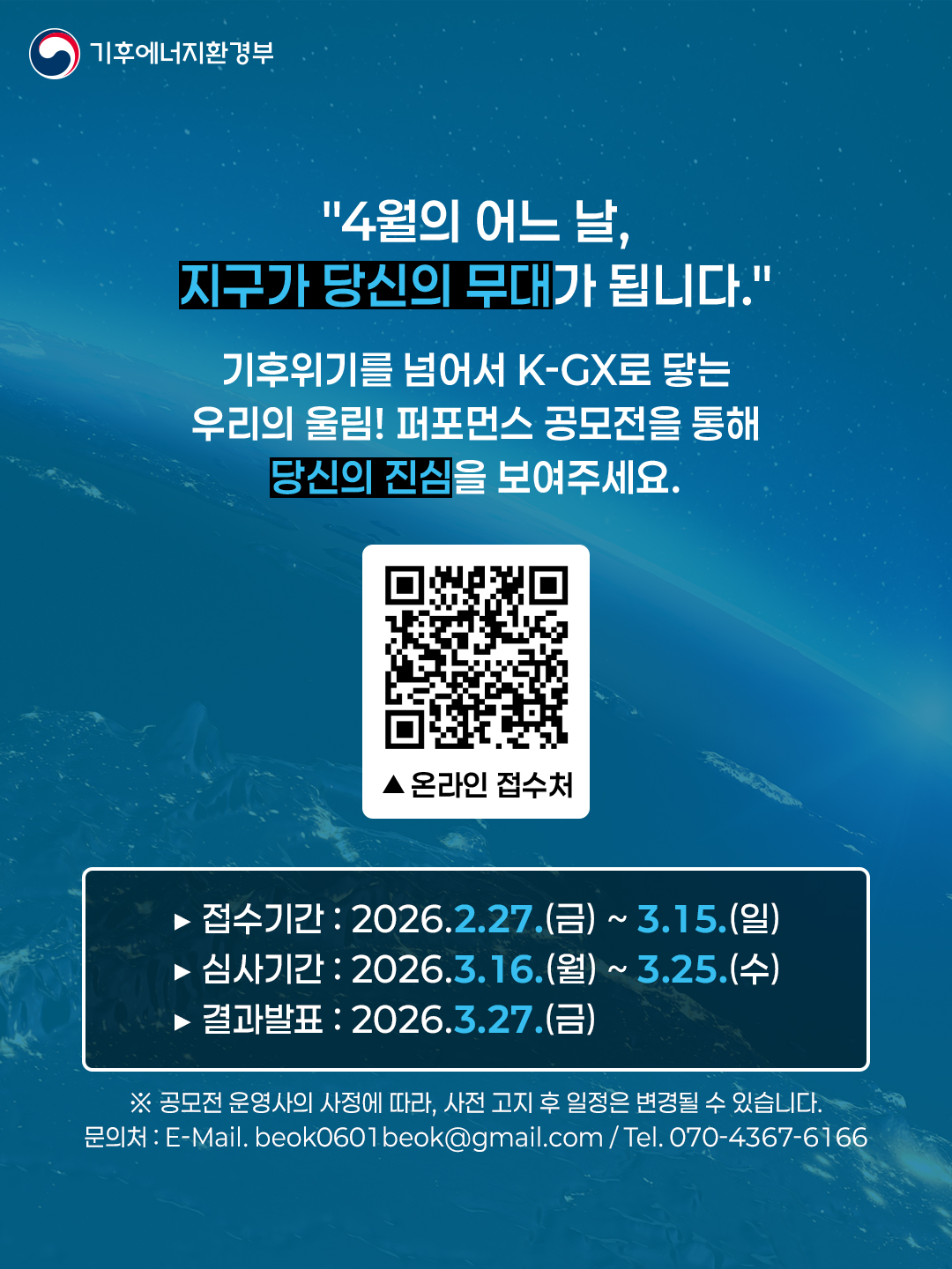 기후에너지환경부에서 「2026년 K-GX 국제주간·기후변화주간 대학생 퍼포먼스 공모전」을 개최합니다. 관심있는 학생들의 참여바랍니다.