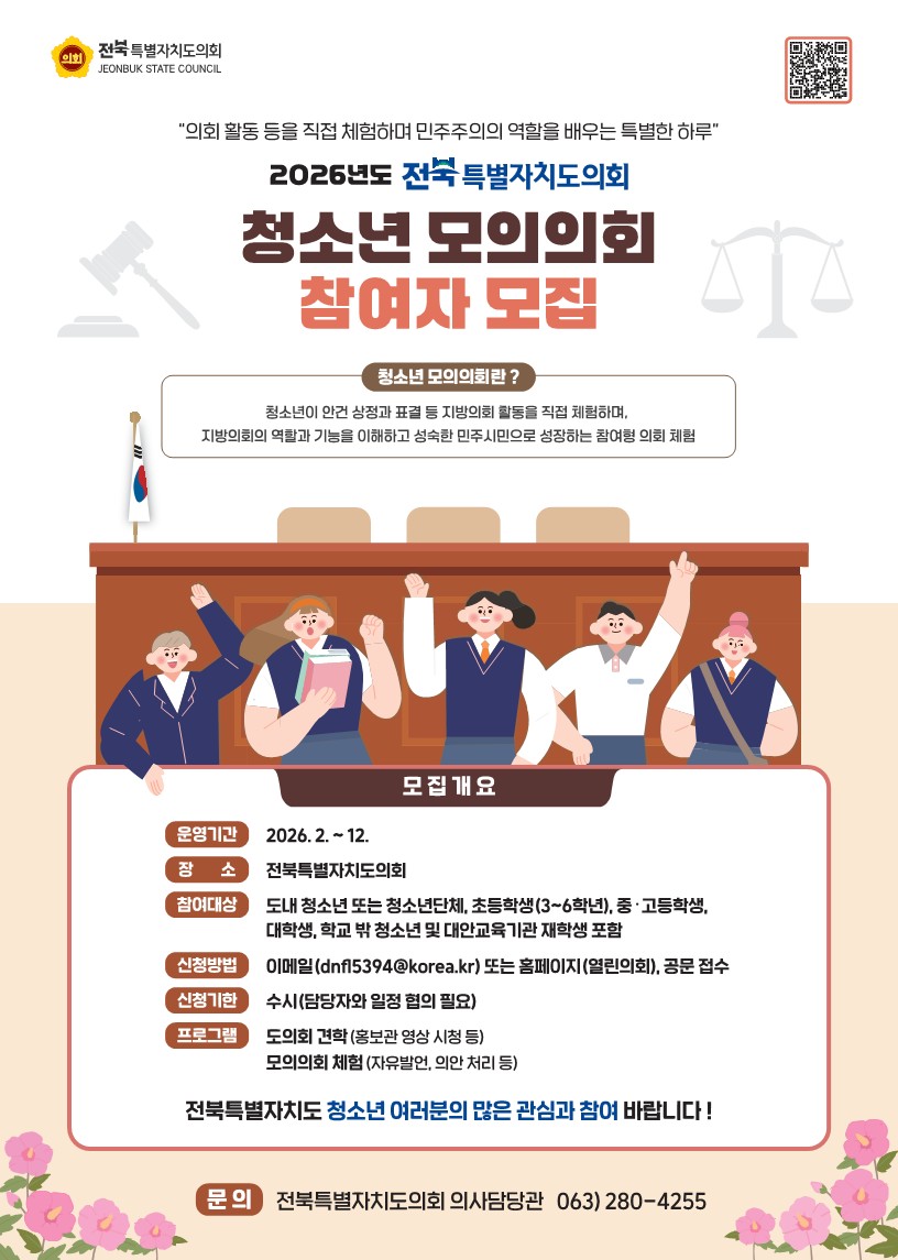 전북특별자치도의회에서 2026년 청소년 모의의회를 운영합니다. 관심있는 학생들의 참여바랍니다.