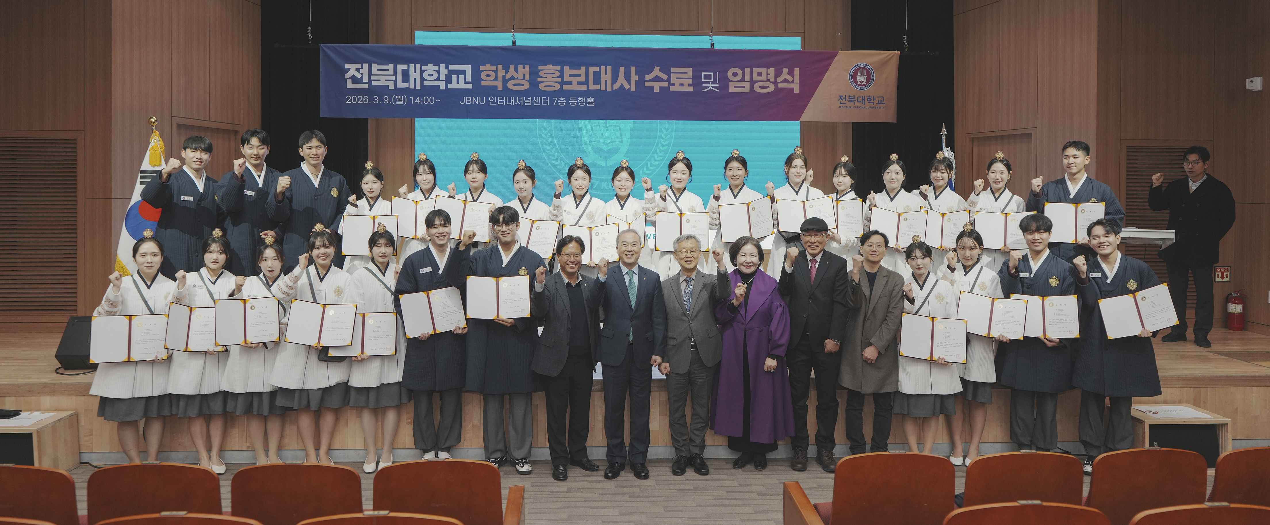 정진욱 제26기 학생 홍보대사 대표는 “우리 전북대학교의 대외 브랜드를 높이기 위해 수요자 중심의 맞춤형 소통 채널을 강화하고, 지역과 세계를 잇는 글로컬대학으로서의 위상과 혁신적인 교육·연구 성과를 대중의 눈높이에 맞춰 효과적으로 전달하는 데 최선을 다하겠다”고 포부를 밝혔다.