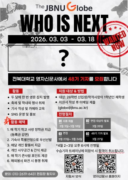 문의사항: 010-2619-6431 황지우 편집장 , 인스타그램: @jbnu_globe 문의