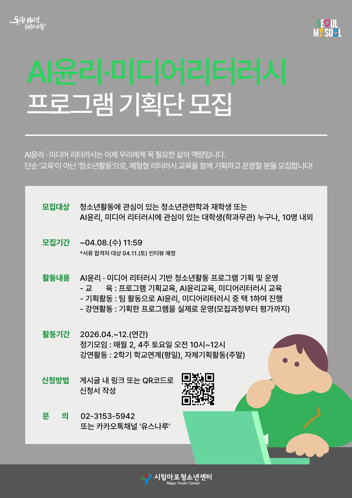 시립마포청소년센터에서 2026 AI윤리·미디어리터러시 프로그램 기획단을 모집합니다. 관심있는 학생들의 참여 바랍니다.