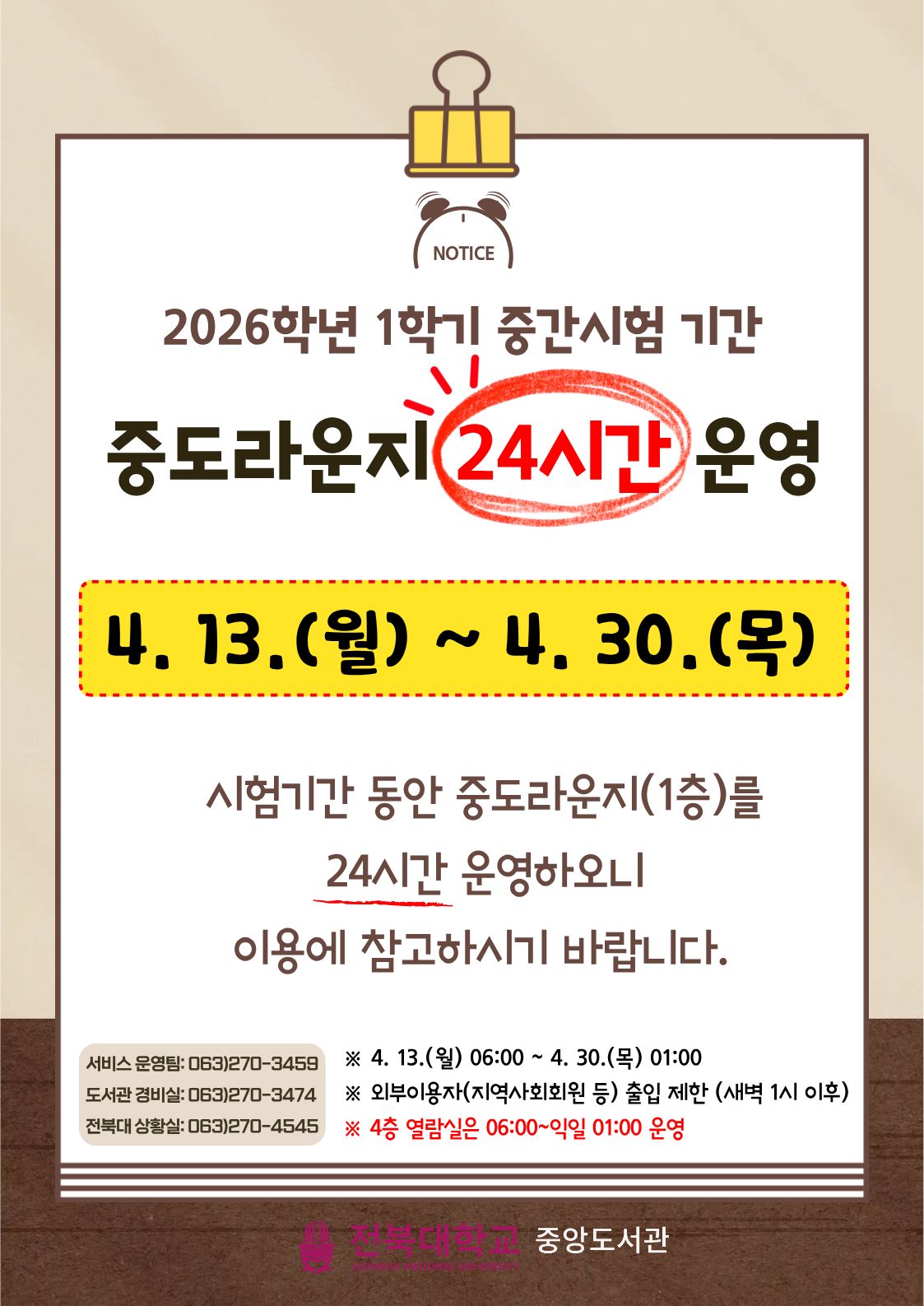 2026학년도 1학기 중간시험 기간 중도라운지 24시간 운영 안내