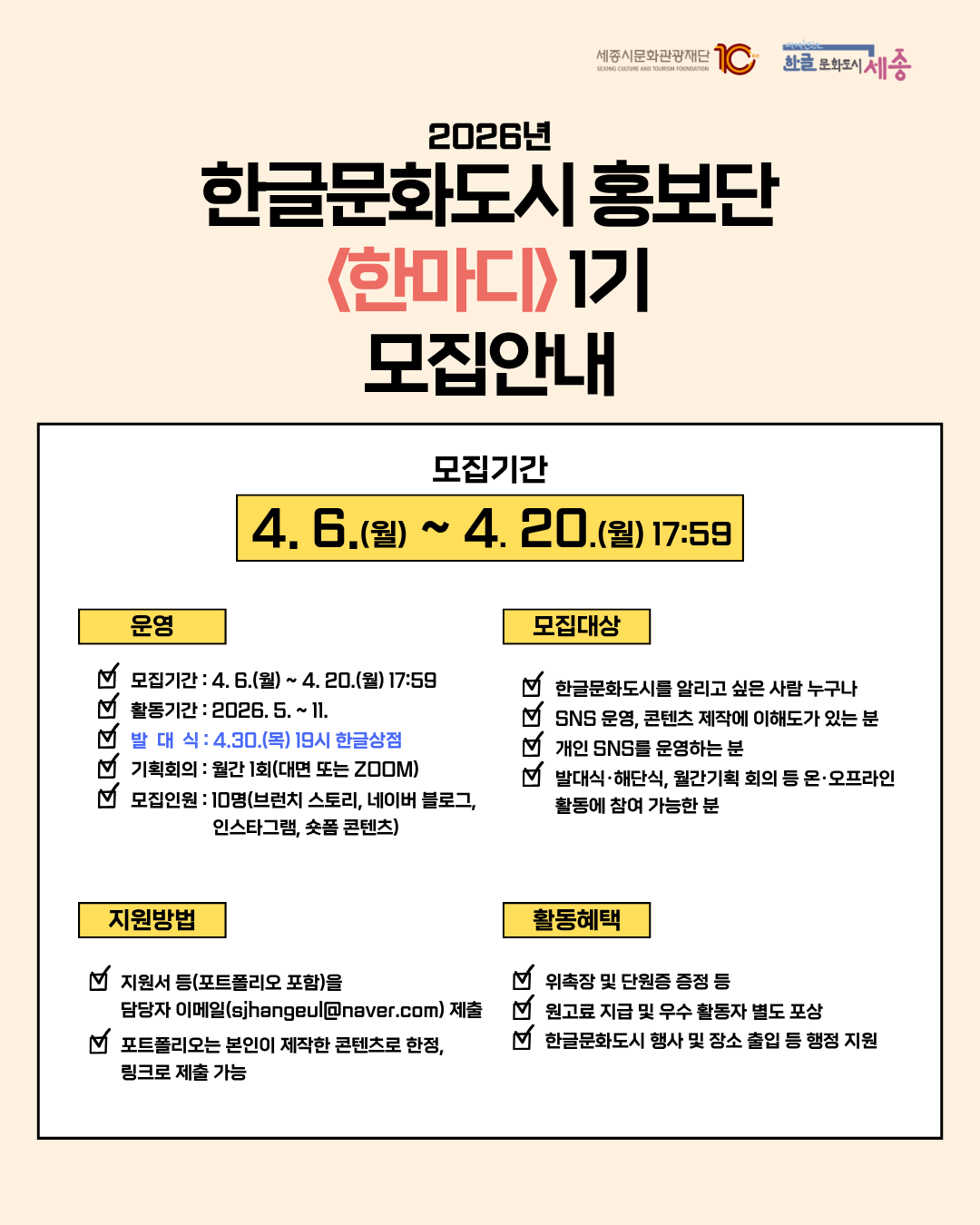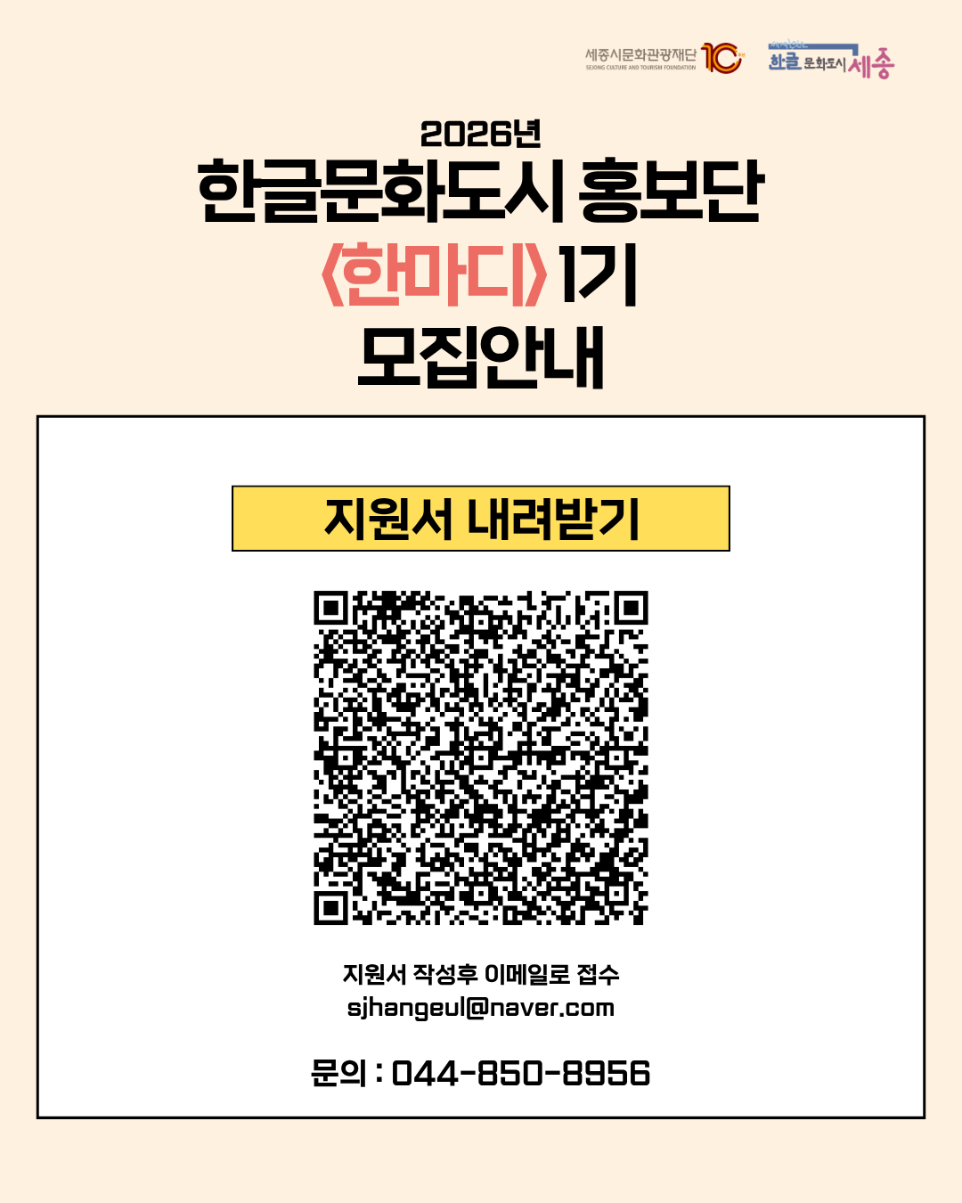 (세종특별자치시) 한글문화도시 홍보단 「한마디」 1기 모집 안내