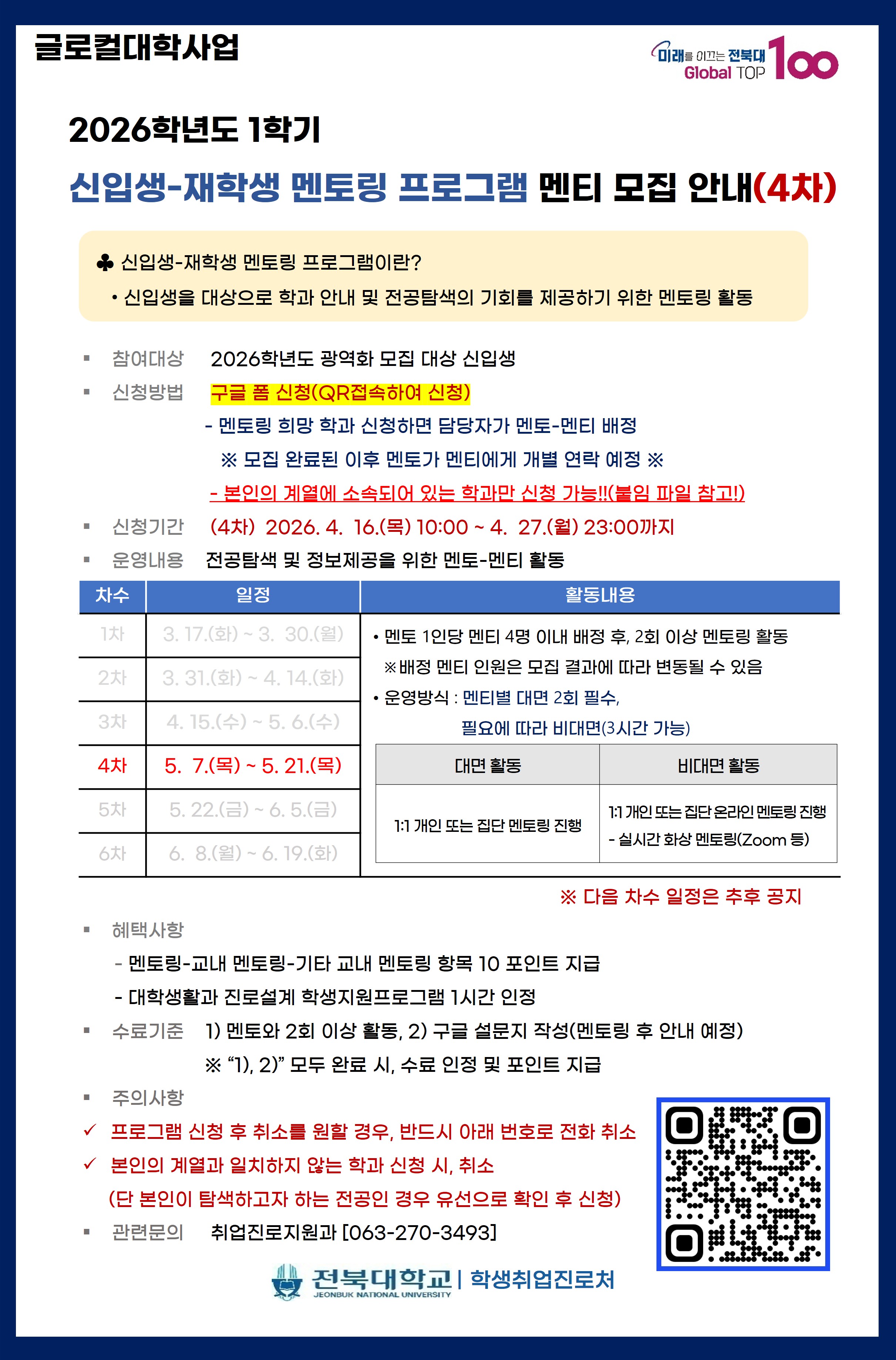 본 프로그램은 2026학년도 광역화 모집 대상 신입생에게 전공 탐색 기회를 제공하기 위해 개설된 멘토링 프로그램입니다.