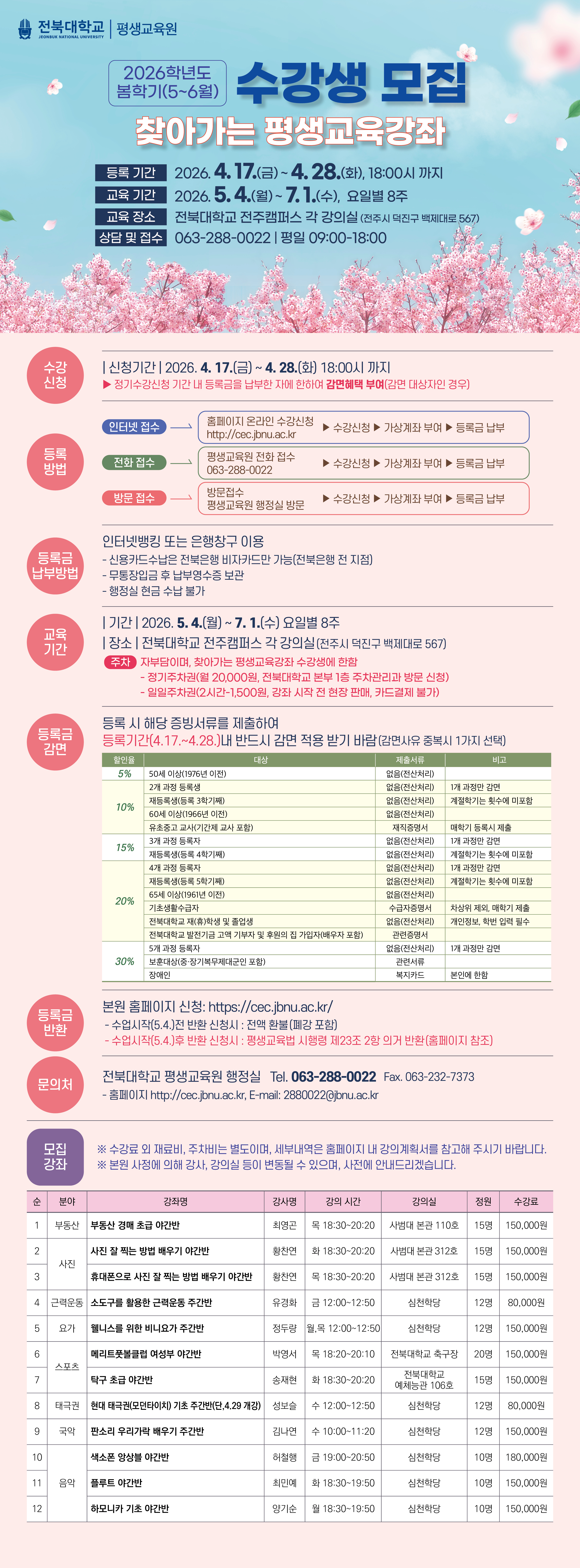 안녕하세요. 2026학년도 1학기(5~6월) 찾아가는 평생교육강좌 수강생 모집합니다.
