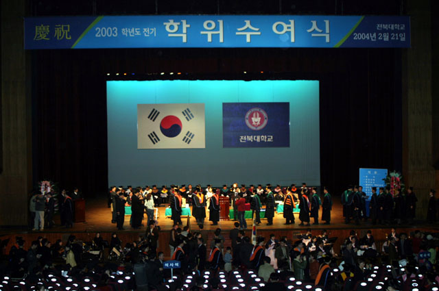 우리 대학 2003학년도 전기학위수여식이 2월 21일(토) 11시 전북대학교 삼성문화회관에서 개최되었다. 올해로 53회째를 맞는 이번 졸업식에서는 학사 3,112명, 석사 551명, 박사 100명 등 총 3,763명이 학위를 수여받았다.
