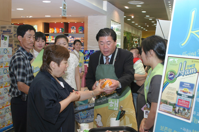 우리 대학 두재균 총장이 2일(수) 롯데백화점 전주점에서 학교기업 활성화를 위해 전북대 햄 일일 판매활동에 나섰다. 우리 대학 학교기업인 ‘전북대 햄’은 지난 3월에 학교기업의 설립·운영에 관한 세부 시행령이 공포되면서 본격적인 생산체계를 갖게 되었으며 이번 백화점 납품을 계기로 일반인들에게 시판된다.