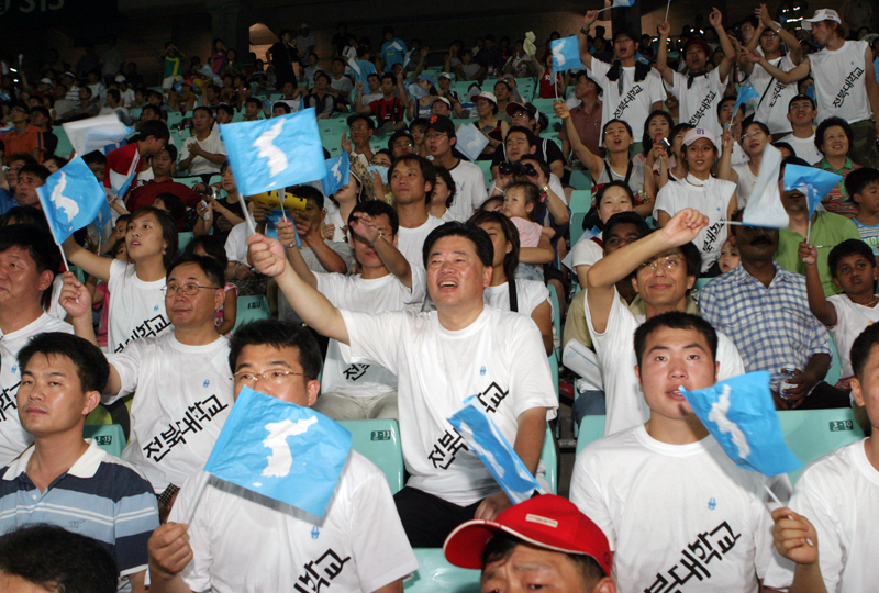 전주월드컵경기장에서 열린 응원전에서 “조국통일”, “세계 최강”, “우리는 하나” 등의 구호를 외치며 열렬한 응원전을 펼쳤으며, ‘아리랑’과 ‘오 필승 코리아’를 개사한 ‘오 통일 코리아’와 같은 노래도 불렀다.