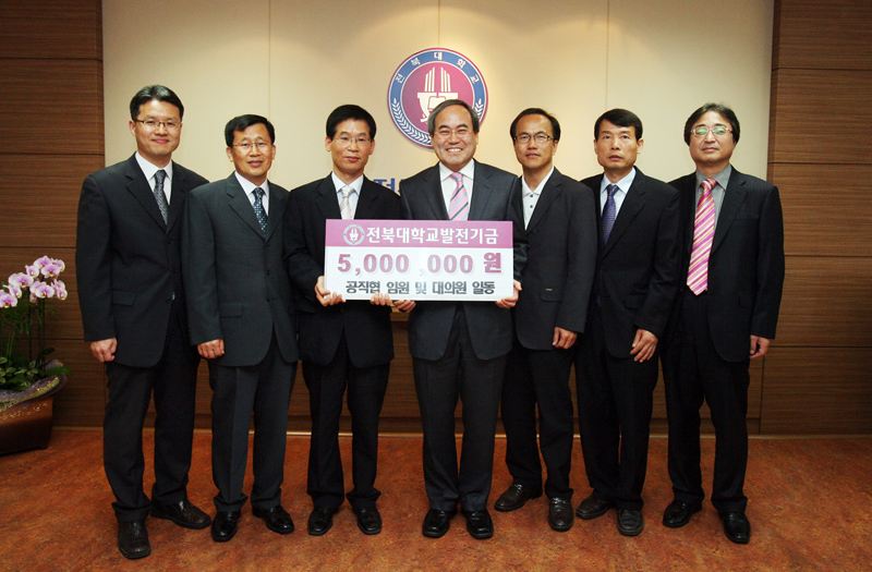 5월 4일 오전 총장실에서 열린 발전기금 기탁식에서 공직협 윤성문 회장을 비롯해 하태종 수석부회장, 조형규 부회장, 이정근 사무처장 등 대의원들은 정성껏 모은 발전기금을 서거석 총장에게 전달했다.