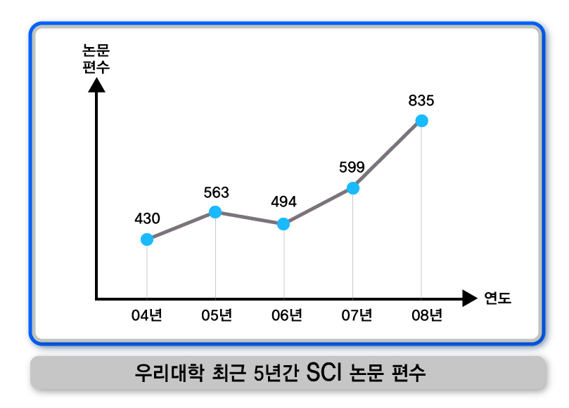 교육과학기술부가 최근 발표한 2008년 우리나라 SCI 논문 현황에 따르면 2007년 599편이었던 우리 대학의 SCI 논문수가 2008년에는 835편으로 늘어 39.4%라는 경이적인 증가율을 기록했다.