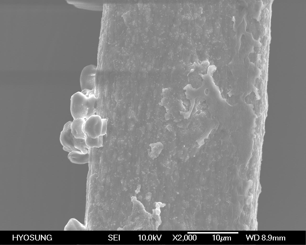 이번에 개발된 섬유 신소재는 제품화를 담당한 섬유 벤처기업 텍산메드테크에 의해 특허 등록을 마쳤으며, 섬유 형태로 적용할 수 있는 마스크와 위생재용 부직포, 공기필터 등을 생산할 수 있는 기반 시설도 구축돼 이 신기술이 조만간 상용화 될 수 있을 것으로 기대된다. <섬유에 흡착된 바이러스 사진(현미경)>