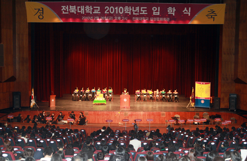 우리대학 2010학년도 입학식이 2월 26일(금) 오후 2시 전북대 삼성문화회관에서 서거석 총장과 처ㆍ실ㆍ국장ㆍ대학(원)장 및 대학 관계자들과 신입생, 학부모 등이 참석한 가운데 거행됐다.