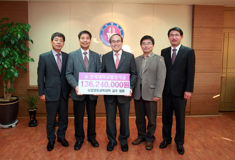 농업생명과학대학 교수들이 대학 발전과 제자들의 장학금으로 써달라며 발전기금 1억3천6백24만원을 기탁했다.