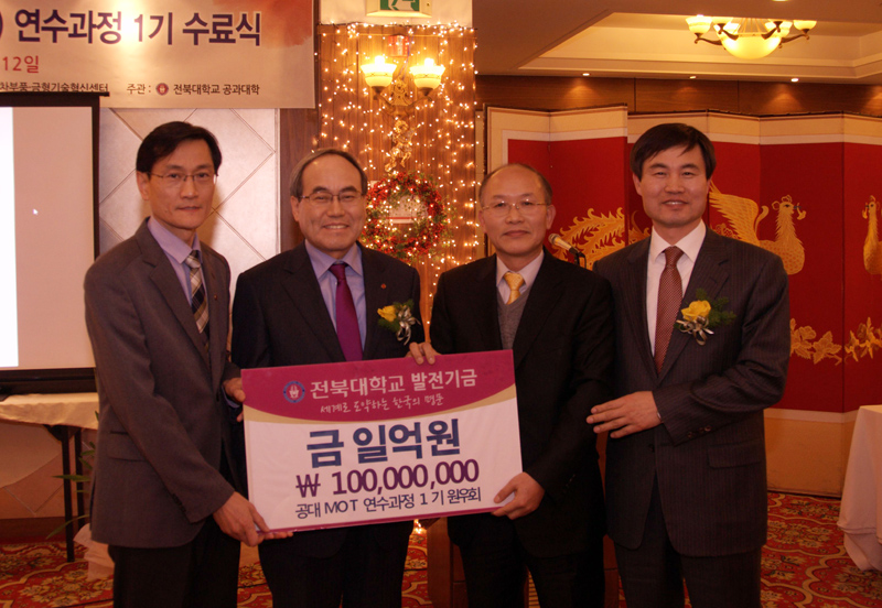 공대 최고경영자기술경영 연수과정(MOT) 제1기 원우회(회장 강황빈)가 대학 발전을 기원하며 발전기금 1억 원을 쾌척했다.