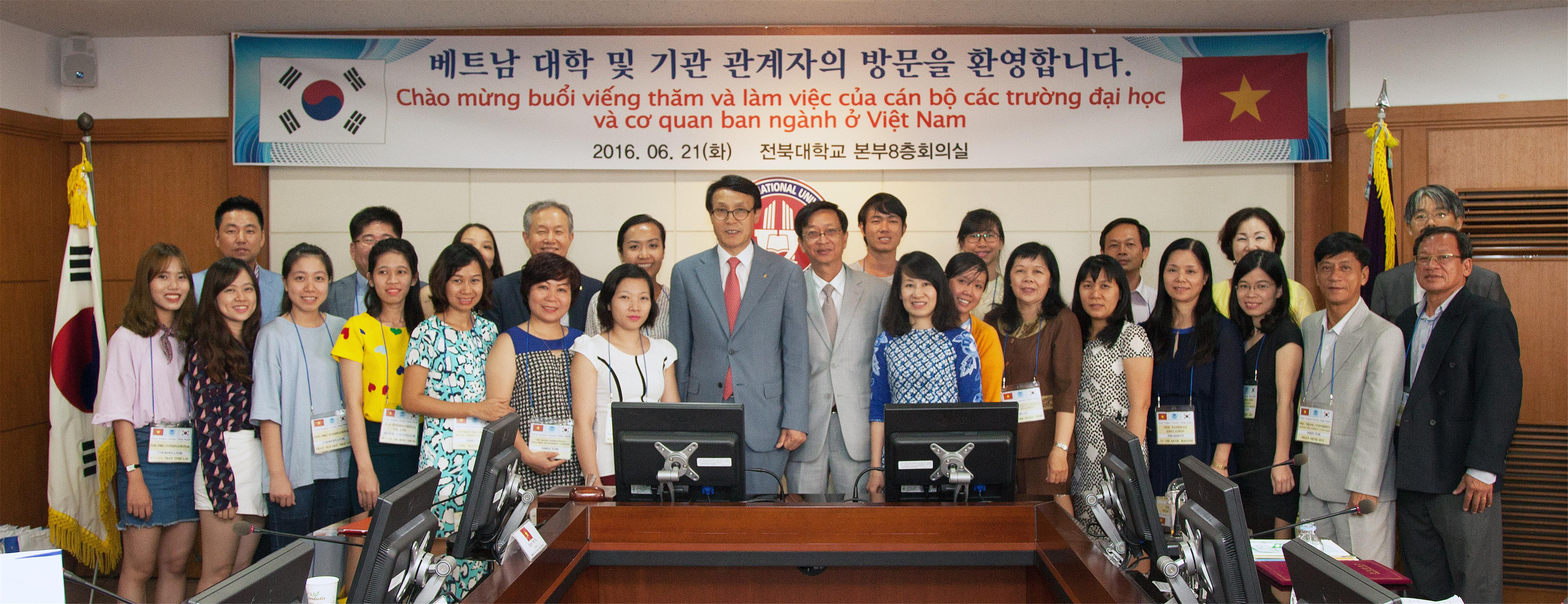 베트남 안지앙대학교 땅반보 총장과 호치민시립외국어 정보통신대학교 난 뜨란 부총장, CRISOP 교육자문 오아 응구옌 대표 등 유학기관 관계자 등 19명은 지난 6월 20일부터 22일까지 전북대를 방문해 기숙사 등 주요 교육시설 등을 참관하고, 캠퍼스투어와 입시제도 설명을 위한 간담회를 가졌다.