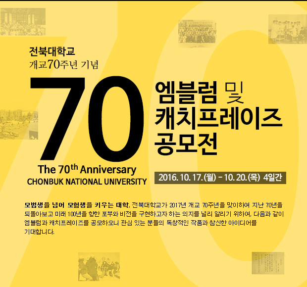 이를 위해 9월 27일부터 이를 공고한 뒤 10월 17일부터 20일까지 4일 동안 우리대학 홈페이지(http://www.jbnu.ac.kr/70th)에서 작품을 접수받을 계획이다.